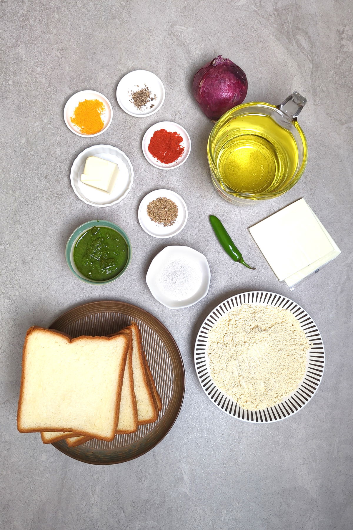 Bread pakora typically comes in two forms: one stuffed with spiced mashed potatoes, and the other, this one, with a layer of chutney and cheese. They are dipped in a spiced besan batter and deep-fried.