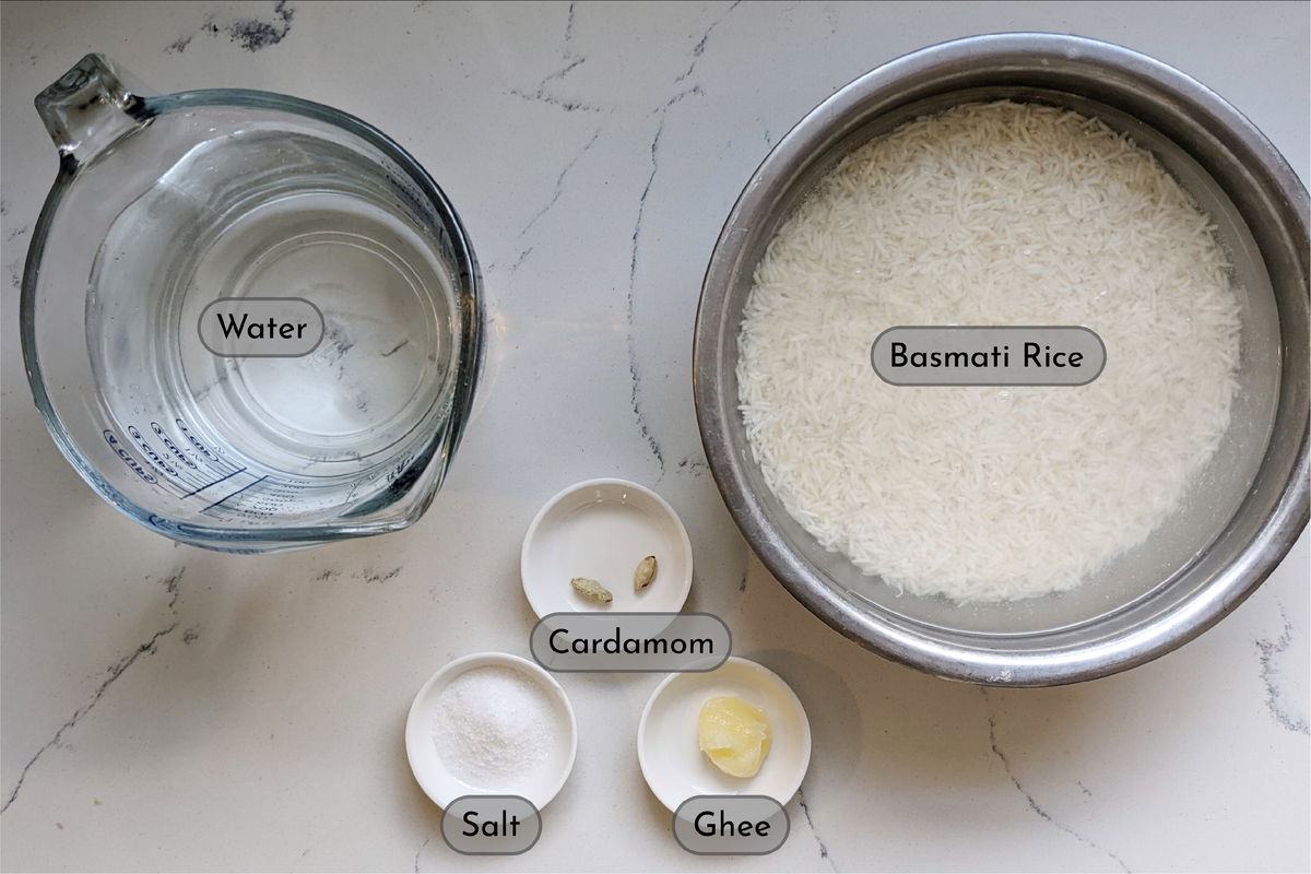 - In a large saucepan, bring 4 cups of water to a boil. Add salt, cardamom pods, and ghee. Wait until the water is at a rolling boil before adding the rice. Add the soaked rice and immediately set a timer for 7 minutes. This will cook the rice to about 80% to 90% done. You can test this by taking a grain of rice and pressing down on it. The sides should mush but the center should break.
