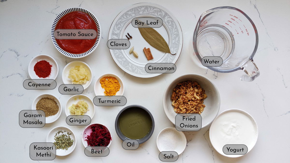 - Whisk the yogurt with a fork or a whisk and add it to the pan along with the red chili powder, grated beet (or food coloring), garam masala, and fried onions. Mix well. Cook for about 2 minutes.